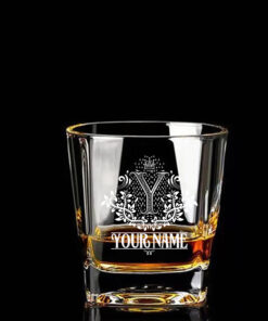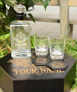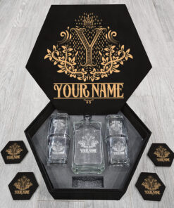 CUSTOM NAME – WHISKEY SET (Wooden box + Decanter + 4 Glasses + 4 Coasters) W1