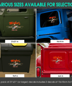 These are large transparent decals, with the option to trim the border. The combination of your name and the image of Pin Up Girl sitting on a spark plug surrounded by the winding lines of the pinstripe creates a one-of-a-kind design