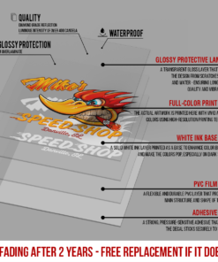 - Qualified Vinyl: The car vinyl decal has five layers: a transparent anti-fading film, a multi-layer ink layer, a transparent decals layer, an adhesive layer, and finally a backing paper layer.