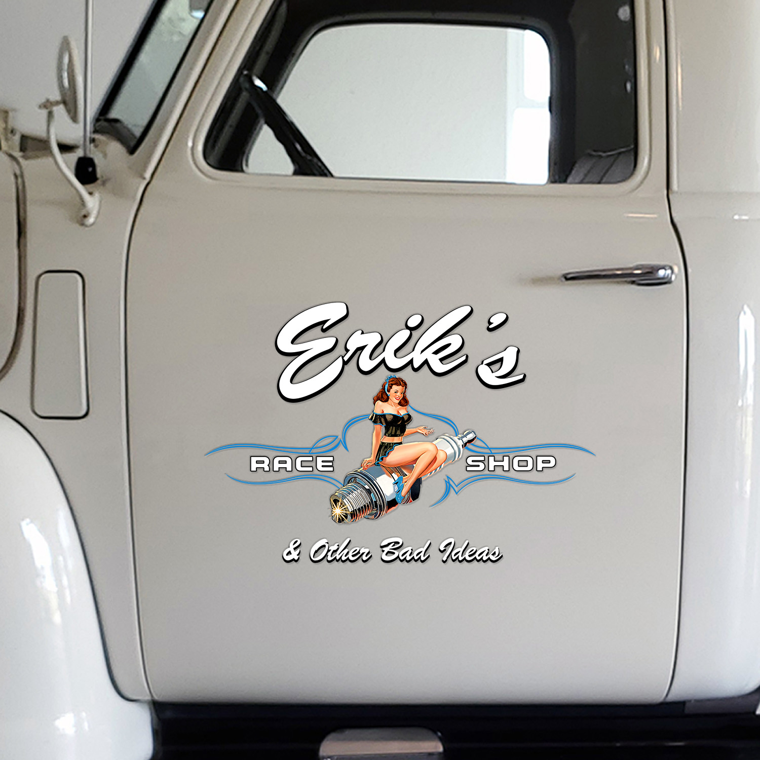 Hot Rod Pinstripe Decals Personalized Pinup Girl Candle Spark Plugs Speed Shop Garage Sticker Set 2 Pcs