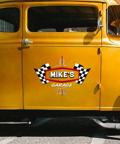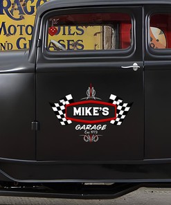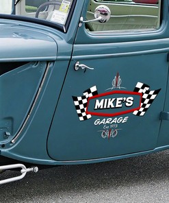 Personalized Pinstripe With Racing Flag Hot Rod Garage Decals